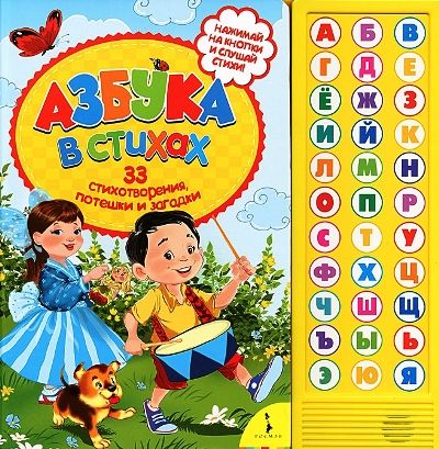 Азбука в стихах. 33 стихотворения, потешки и загадки. Книжка-игрушка"Азбука в стихах" поможет вашему малышу в игровой форме выучить русский алфавит, а веселые стихотворения, потешки, загадки, яркие иллюстрации и интересные задания сделают этот процесс еще увлекательнее. Звуковой модуль на 33 кнопки. Для детей дошкольного возраста.